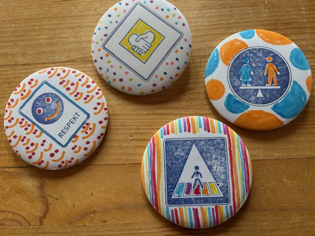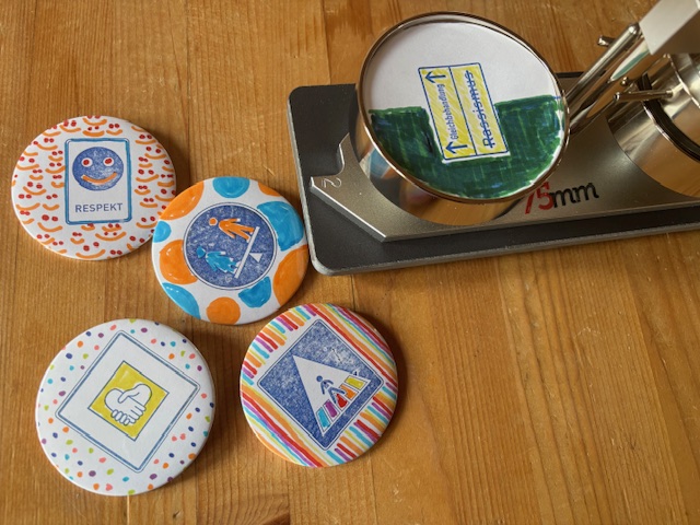 Die Stempel der „Verkehrsschilder der Gerechtigkeit“ können für Gruppenarbeiten eingesetzt werden. Eine Weiterverarbeitung zu Buttons ist ebenfalls möglich.